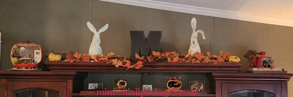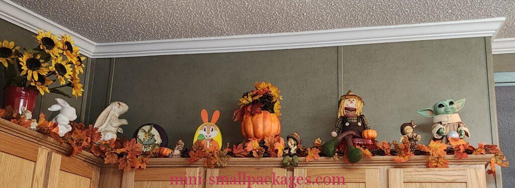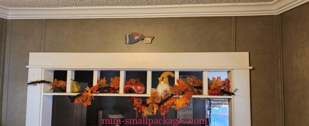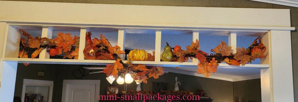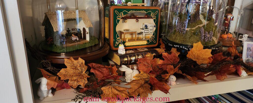 Periodically I like to rearrange my miniatures. This year I went crazy for me buying Fall leaf garland. Then I used it in several places in my home.