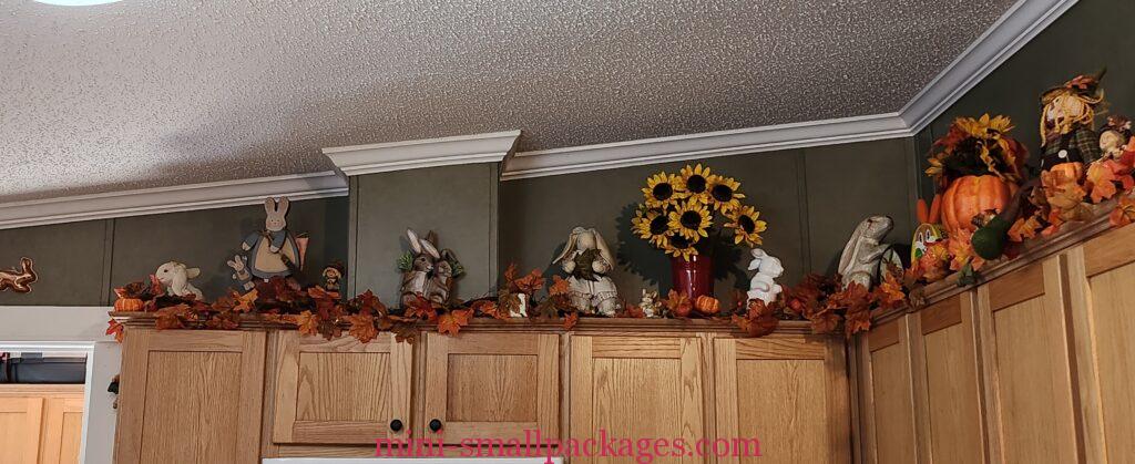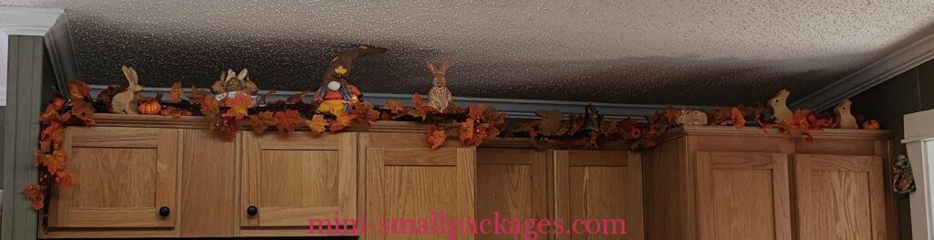 First, I removed all the spring stuff and any rabbits that were too spring. This left about half that are either brown or plain. Then I started spreading the rabbits around and added the garland. I figured out right away that I did not buy enough garland. Especially for the cabinets that are a corner. I went back to the store and got more garland. Again I began adding the garland to the cabinets. This year I tacked them down because of cats. Also the garland wanted to flip around a little bit sometimes so tacking them strategically to the cabinets helped.