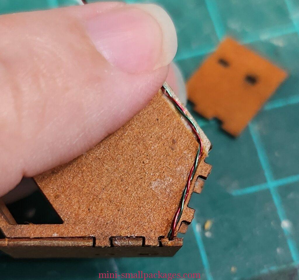 For this one the stall is so shallow that having the light entrance at where the back meets the roof is acceptable versus coming out at the top of the roof line like I did on the toy shop. I cut a tiny hole in the back where it meets the roof.