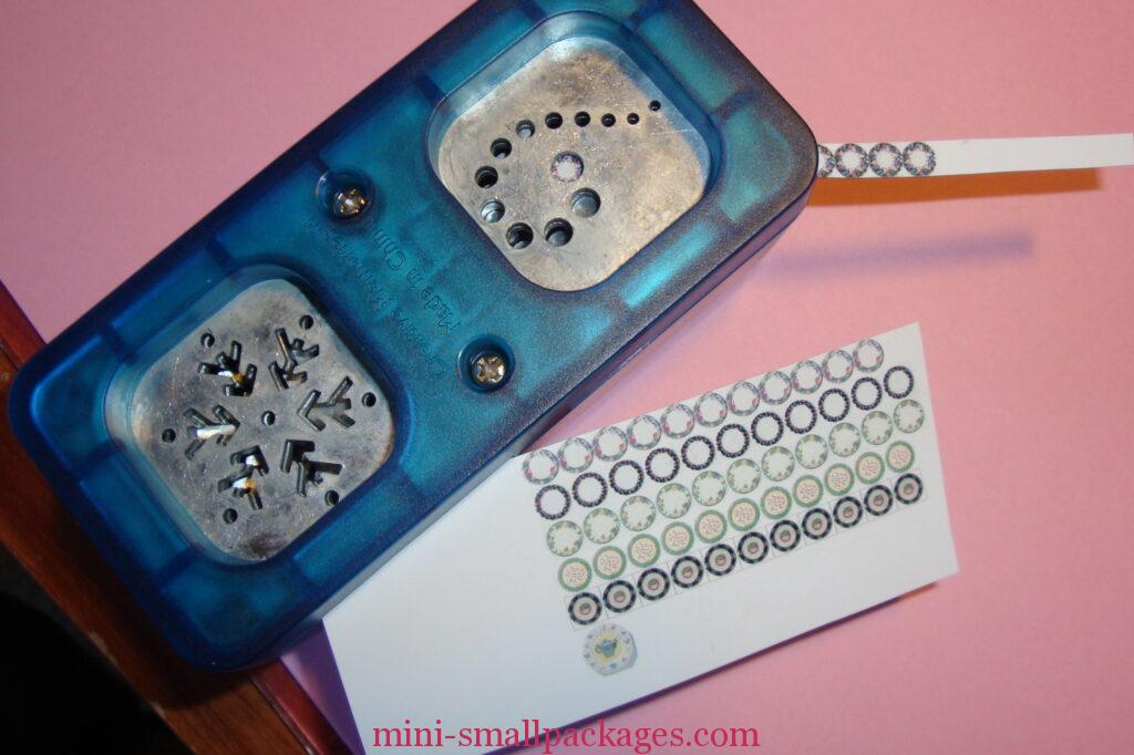 I turn the punch upside down so I can line up the printed plate with the hole I want to use. Then very carefully I squeeze and punch. Sometimes I had to adjust the plate to the hole to line it up several times. When just inserting the strip the plate might look to be lined up but it isn’t once the punch starts to come together. That’s why it is a good idea to have more than needed because it can happen that the punch doesn’t line up even with the patience of slowly squeezing and shifting.