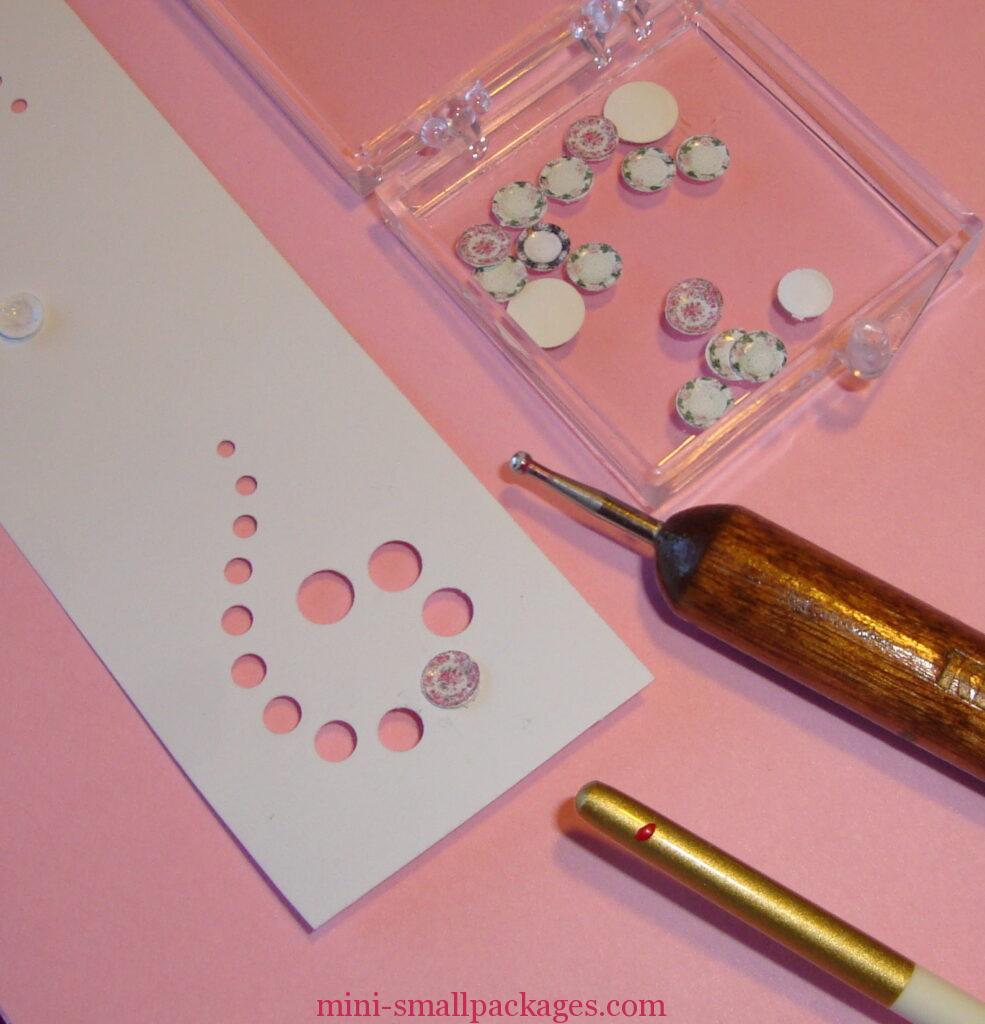 Decided I needed some plates to finish up my NAME Day hutch. I checked my swaps/totes stash and I didn’t have any in the right colors. So I went to my computer were I have stored some pics of plates. I got them from websites selling dishes. Several years ago I made 2 china shops Janie’s Fine China and The Rose Cottage so had a ton of them already. Those shops were 1/144th scale, but I am going to make them in 1/48th scale today.
