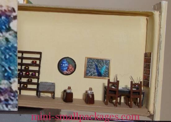 For the student artwork I used a lot of beads and other bits. I printed a few things for the walls. I collected images from the internet and resized them down to suit what I wanted. The most fun was making the Glass artwork. I used plastic to make my glass. Both the window and door glass and the glass artwork were made from plastic.