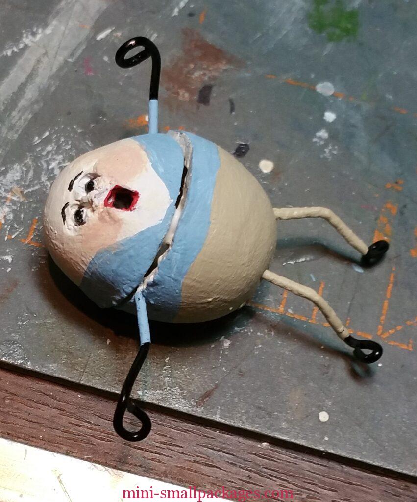 I wanted an egg for Humpty, but also didn’t want to buy one. I made him using polymer clay. First I made a egg shape of foil. Then added a layer of clay. I cut around his middle before I baked him. I also insert pins into the spots for the wires. Then to the oven.