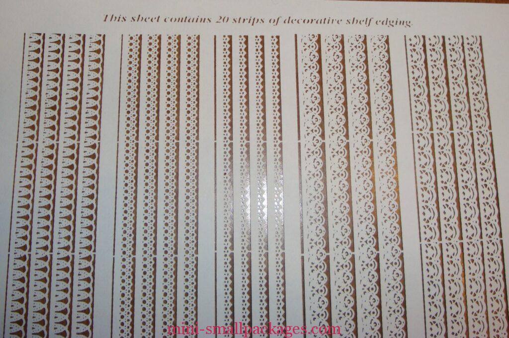 I went to a show and I just happen to pick up some shelf edging that is lacy. It is for 1:12 scale but I was happy with it for this application. I used a portion of the middle one. I trimmed some from the solid part. If I didn’t get that I would have most likely used paper scissors with the fancy curves like Joann did with hers. I have a smaller scallop would try or even just a wave. It would be possible to cut once and then go back with same scissors and carefully cut additional curves. Or I would get out my craft knife and do some curves free-hand. I did just purchase a swivel head craft knife and would have tried that. I wouldn’t have worried if each curve was even, just does it look good overall on the sections that get seen at any one time.