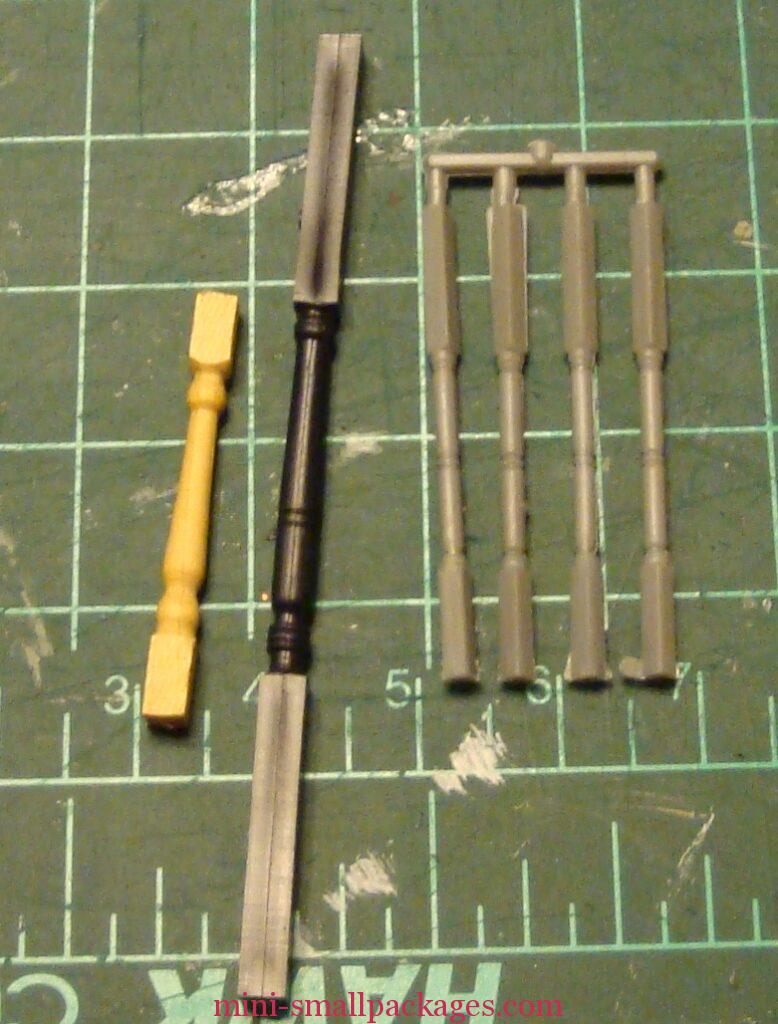 The round table is made from a HO scale porch post that I cut to length – one on the right. The others were options I considered. I used some scrap wood for the feet and a 1/4″ round woodsie for the table top. I added the lace edging from the far right in the pic near the top of this post. I trimmed the top section so it just has swags and then once glued around the table top and once painted, it gave a carved look to the table edge – Sweet! Loved it so much used it for the cake table as well.