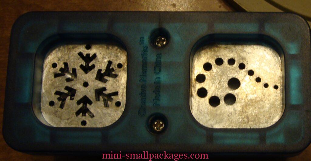The 3 tier server – I used a swirl round hole punch to punch the various sizes. (Larger punches that punch different parts are a good source of different sizes we can use in smaller scale minis – use your ‘mini’ eyes when looking at punches for this purpose.) The center is a straight pin cut down to height with silver spacers from crimp beads, I used one for the top and two each for the middle and bottom section. Silver marker was used to added the edging to the plates of the tiers. The cookies on the tiers are 1/16″ round punch with painted hearts.