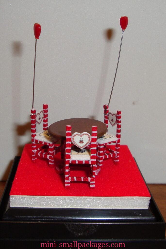 To fill them I used two hearts 5/32″ punched from paper. One double layered and the other I wrapped in pink candy foil I saved from some real Valentine candy. I also had some punched hearts 1/16″ – same I used previously on the chair back, to glue 2 to a piece of wire, then added a glossy glue to make them look shiny like suckers. I painted the wires white.