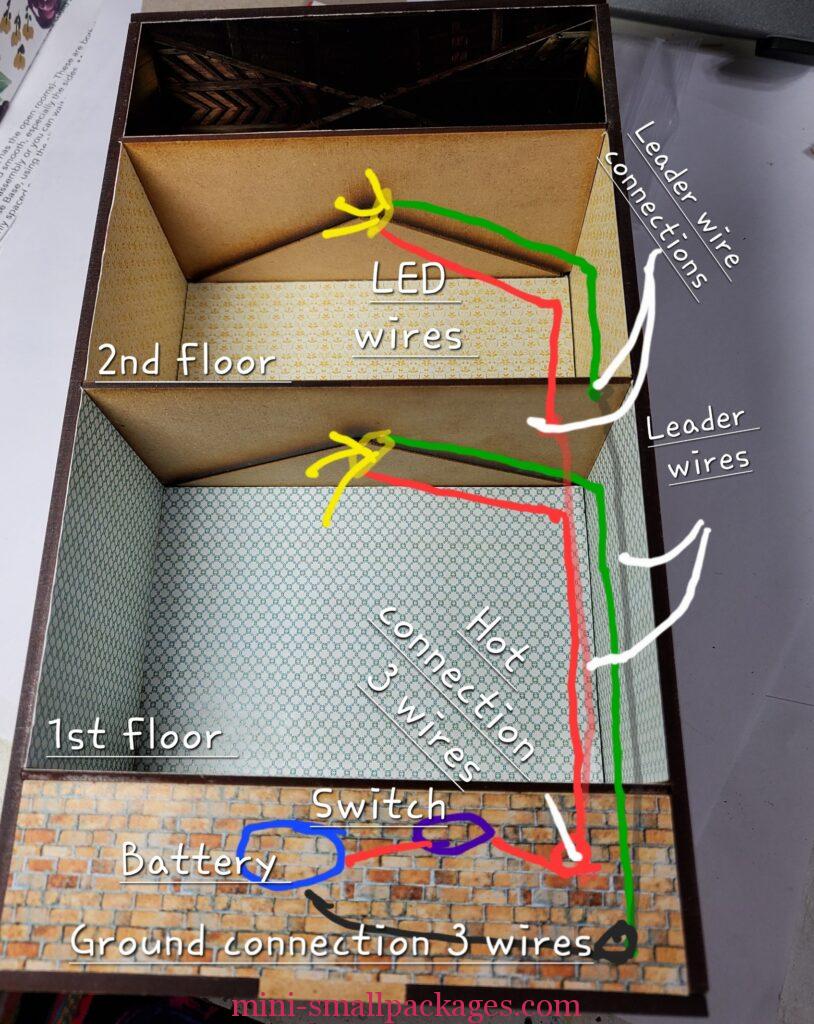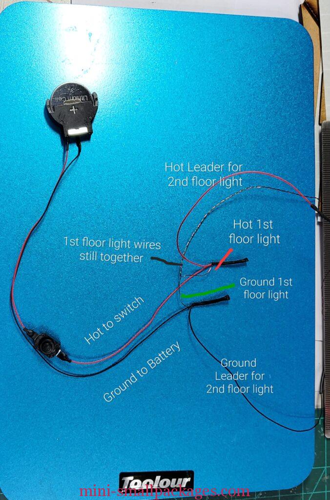 Once the lights were glued in, I realized I really needed longer wires for the light for the second floor to reach the battery. Not to worry, I will add some wires to make them longer. Obviously it would have been easier to order them that way, however when I was ordering, I couldn’t find the longer ones. (I should have asked.)