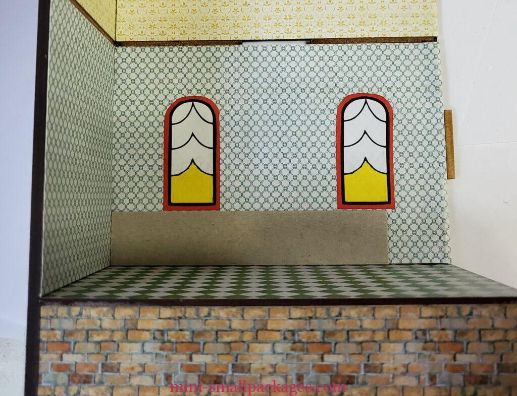 When applying the wallpaper, I will be extending the paper over these grooves on either side. I used spray adhesive for the wallpaper the same used for the exterior. When placing the paper, I used the groove for the floor as my guide. On only one paper did I need to trim the top. I just want the floor pieces to fit without any extra from the wallpaper.