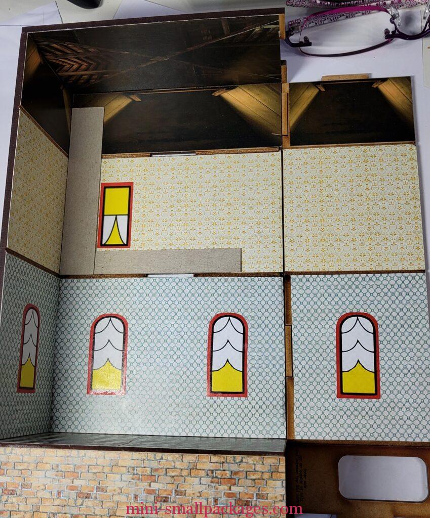 I continue adding the wallpaper to the the three walls making sure everything lines up. I also paper both ceiling and floor for the attic. However I don’t add ceilings paper to either of the in between floors.