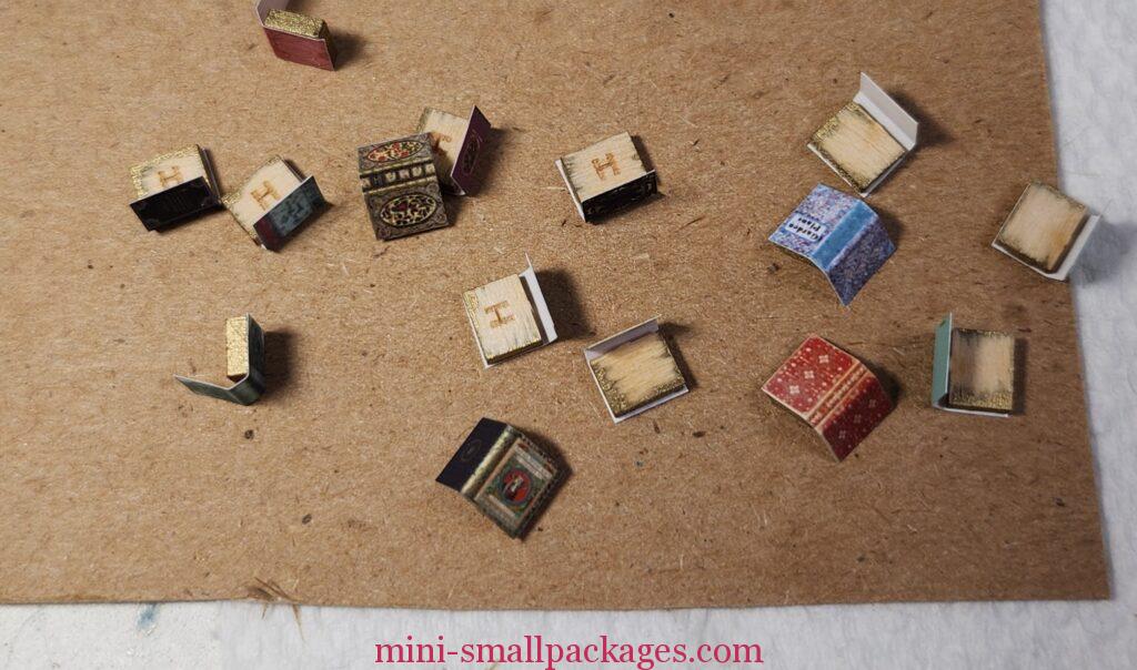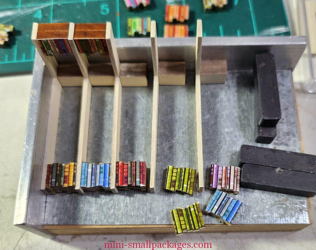 One group wasn’t tight so fell out when I picked it up from the plastic box. That’s when I thought to use blue tape. This works especially well if one doesn’t have a plastic box lid to use and also it holds the books temporarily so no need to make them tight. Then can apply glue to the books individually. If the books are tight, then can remove the tape from the back to glue. But if not, then the tape removes the books.