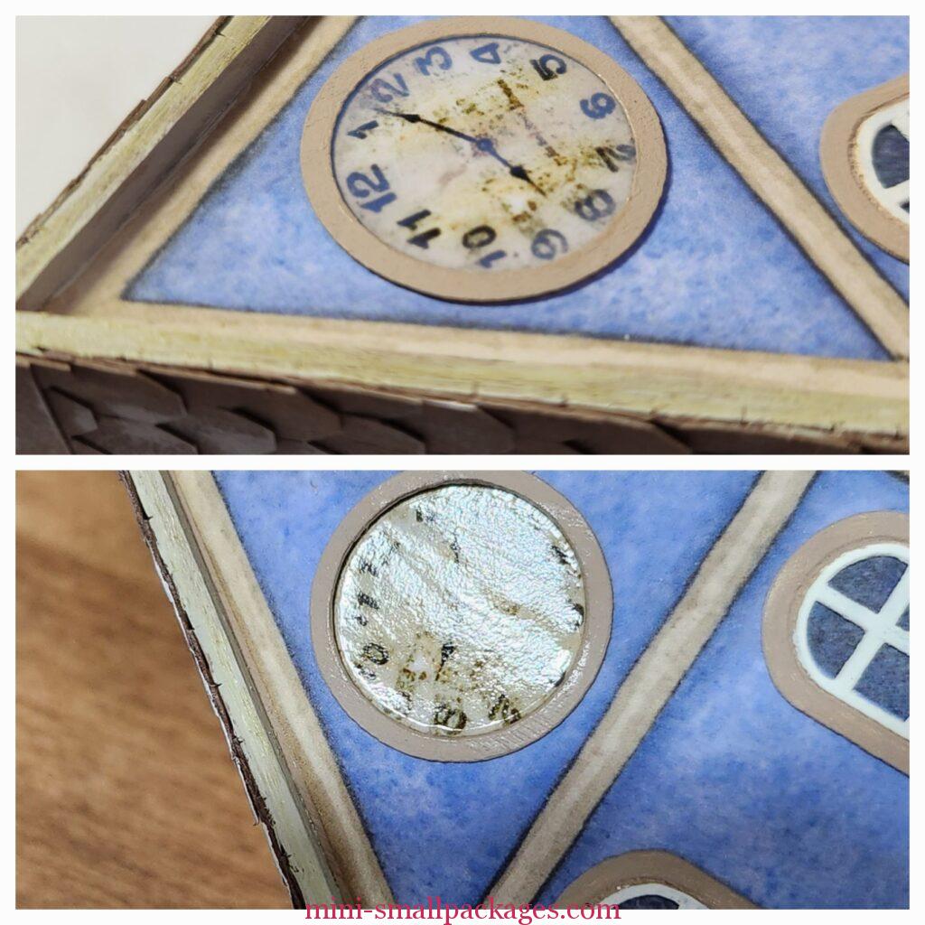 Wait! I think. As I was putting the exterior over the Interior, I realized it needs something. I had added the door hardware and the number already. It was just to plain, so I added greenery to the windows and then thought, it needs more. Leftover clock faces to my rescue.