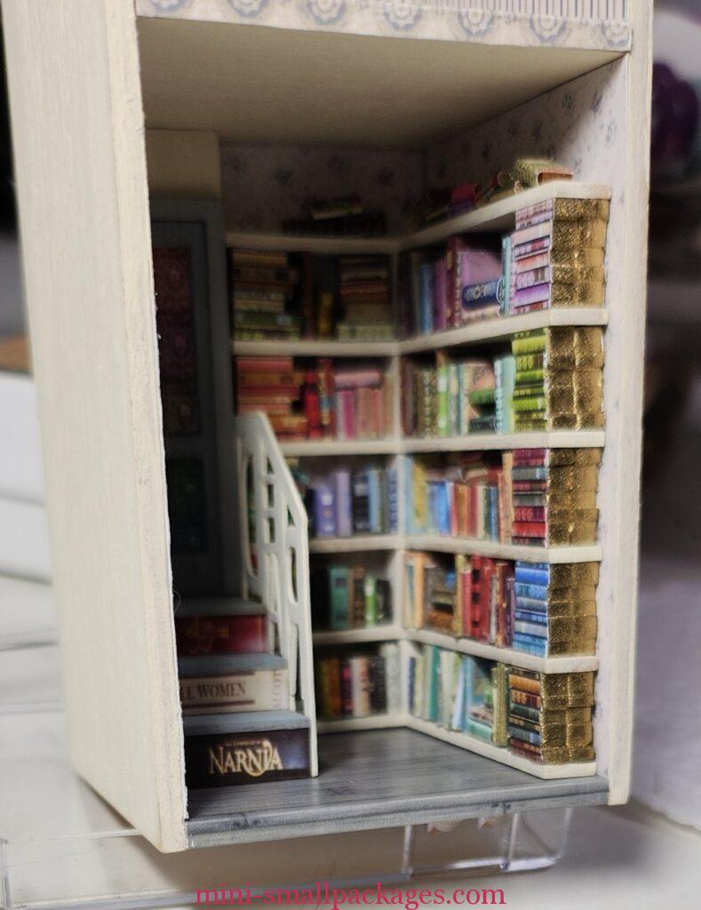 Next up getting it in place. Robin says to be sure it fit… before putting books on. Yes, very good advice I thought I had heeded. Only once the books were on I couldn’t get it to slide all the way back. That was my mistake not pushing all the way back before adding books. I was able to sand the spot that was sticking, however, I didn’t need glue to keep it in place once inserted.
