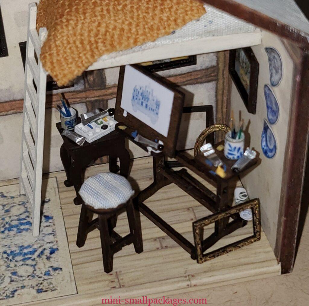 We were provided with foil to roll for the paint tubes and they were just the neatest thing. I used a strip maybe 1/4th inch wide. I rolled around my smaller quilling tool. After rolling so far I decided to stop and apply a touch of glue. The width of the roll to make ones in scale. Granted tubes do come in different sizes. After that is when I cut then into 2 tubes. Certainly I could have rolled the full width then cut them apart. However doing so requires one to open one end. Might try alternating direction of each cut. Meaning rotate one quarter turn. This would put the crimped spot opposite. Can then squish together one end for the opening end.