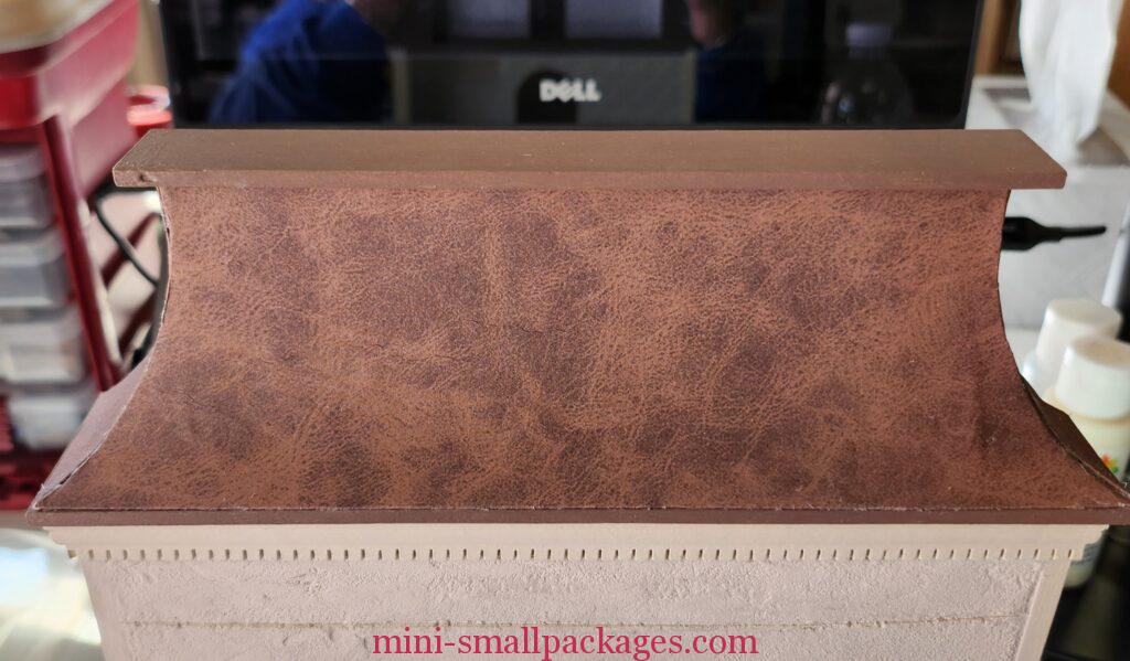 I checked the kit photos and yes, there is the extra edge showing. I am satisfied with the fit so I apply the brown roof paper to the front of the pattern. It was installed but I it requires holding while glue dried.