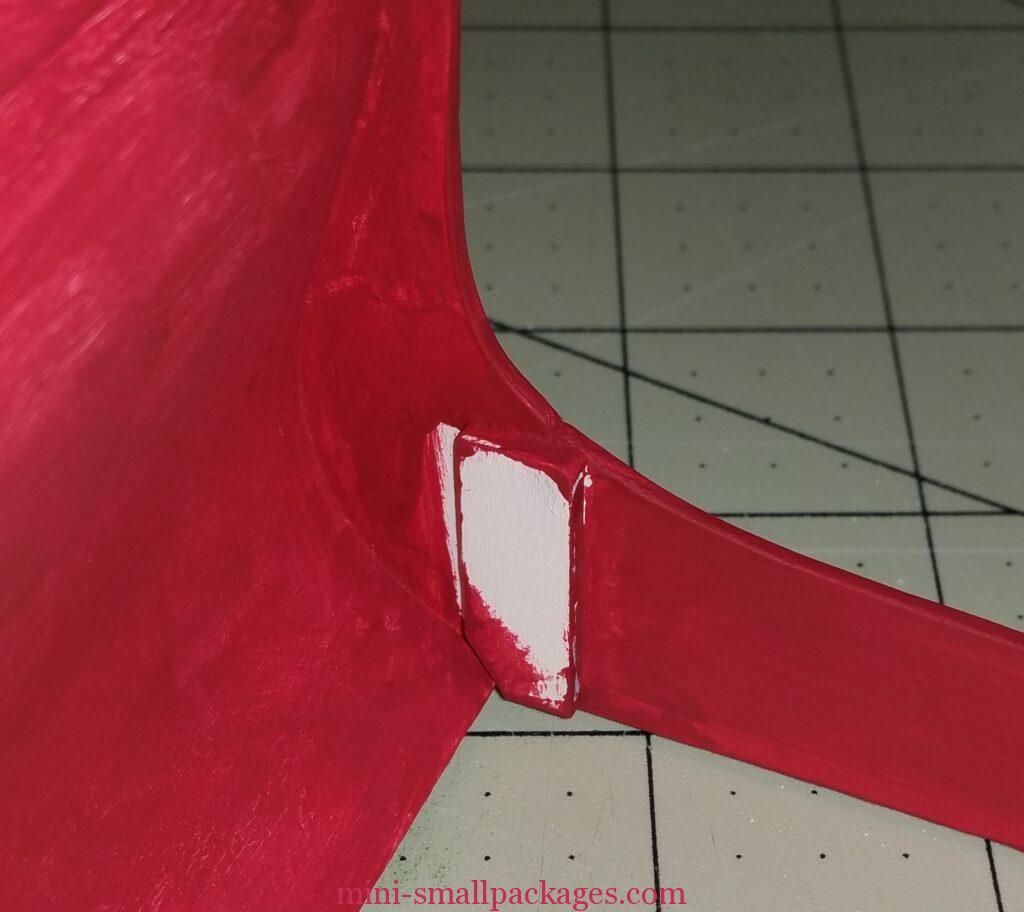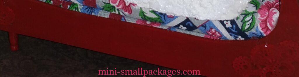 I was trying to decide if I wanted to add white back to the design with dry-brushing. I really like the aged look in the lower right – using a brown stain that I then covered with a gloss.Next I finished the blue and red fabric as the bed covering as it was the one I liked the most with the red glossy bed. Notice how much darker the red is now with the brown stain. Also the stain in the nooks and crannies of the design didn’t stay as much as I would have liked but I am still pleased with the color and finish.