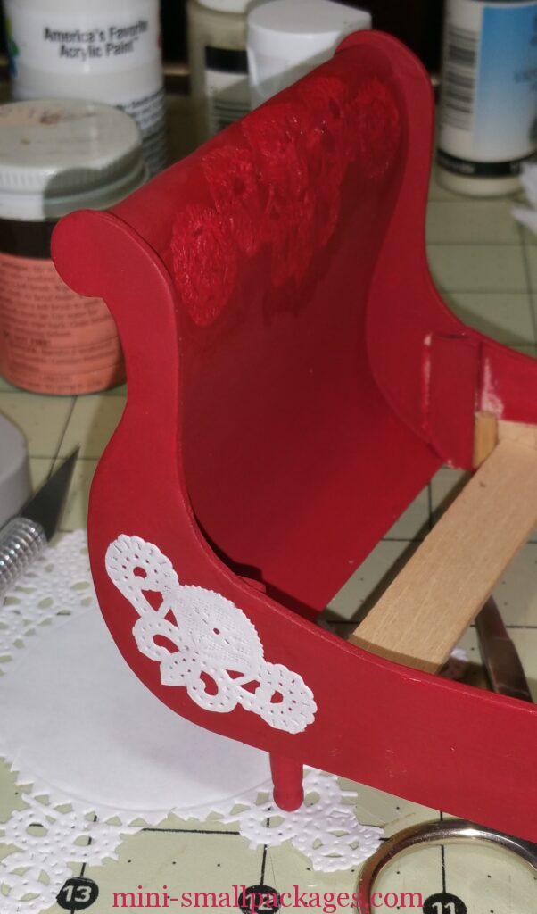 Next I decided I needed to finish the bed itself – the frame color and finish. I wanted to add some sort of decorative design. I had thought about doing some stencil painting. But I wanted something dimensional. So I looked in my stash to see what I could use. I found some paper doilies. I cut some different sections and combined them for the headboard.