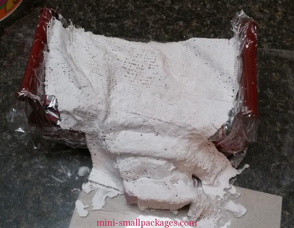 I removed the plastic after working the cloth and it was completely dry. The cloth is very wet so the plastic helped to keep the bedding from being messed up. Also it allowed me to be messier while applying the cloth. I think using the plastic was a good choice for working with the plaster cloth. Once the cloth was dry, I could just lay the snow over the bed.