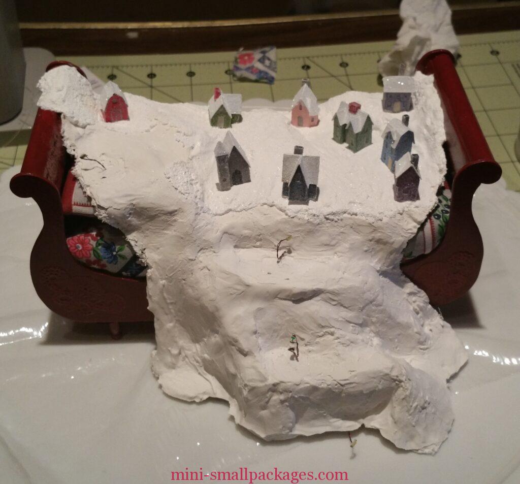 Then it was time to start adding snow. I had visions that I would use the plaster cloth to help with draping. I did use it but in hindsight and other steps, I think I could have done without it.