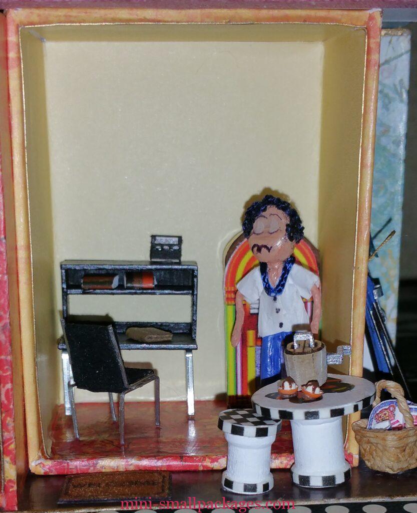 I was absolutely thrilled to get both of these last year. The desk and chair is made by Susan Edmiston and the guy is by Jackie Williams.