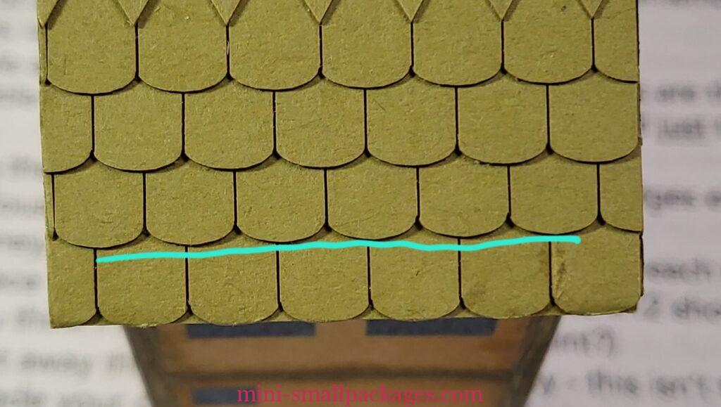 Once sanding is done, I finished shingling. Now in step 7 Robin says she forgot about the chimney. I didn’t. I prefer cutting around after.