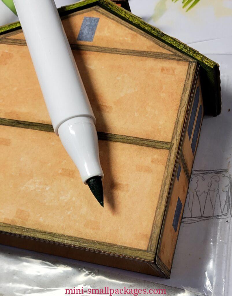The color I used for roof edges was via an alcohol marker in olive green. Although on the wood it could be considered more spring green, especially after applying a satin gloss. I’m happy with the colors so far.